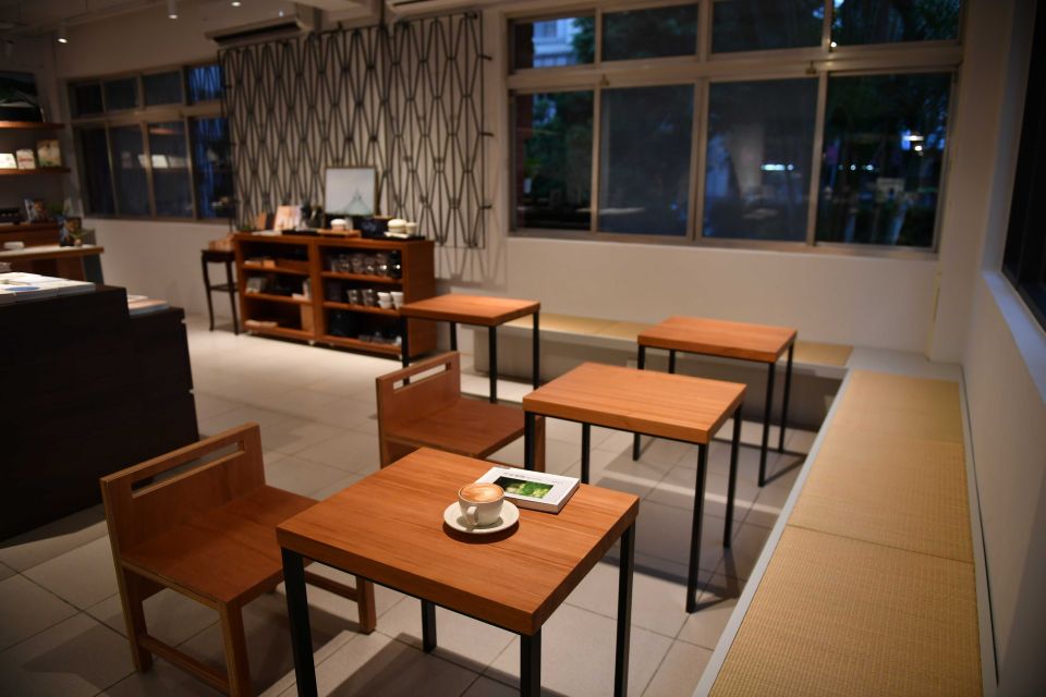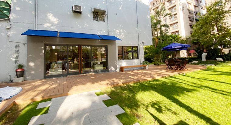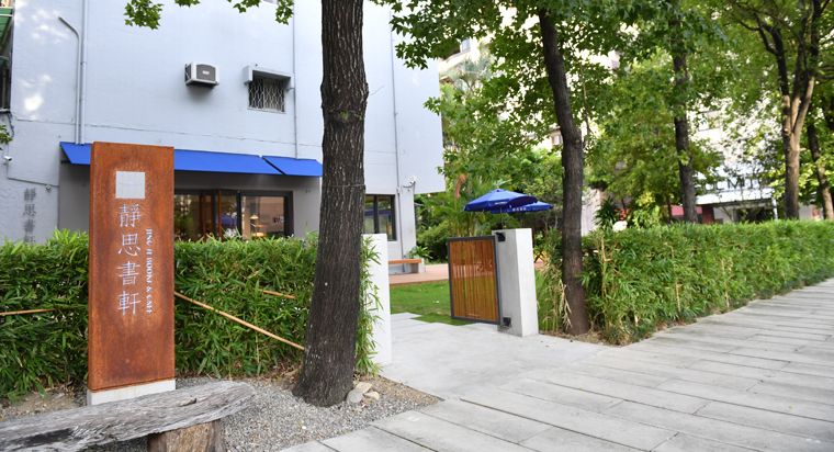 兩把天空藍的大傘,沈穩胡桃木椅,吸引著路人目光,鄰近的小型企業主管,時常來商借場地開會,也是菩薩大招生的好契機。