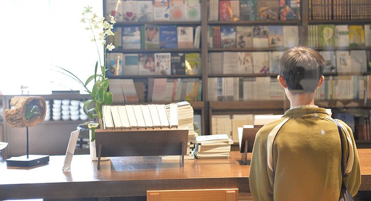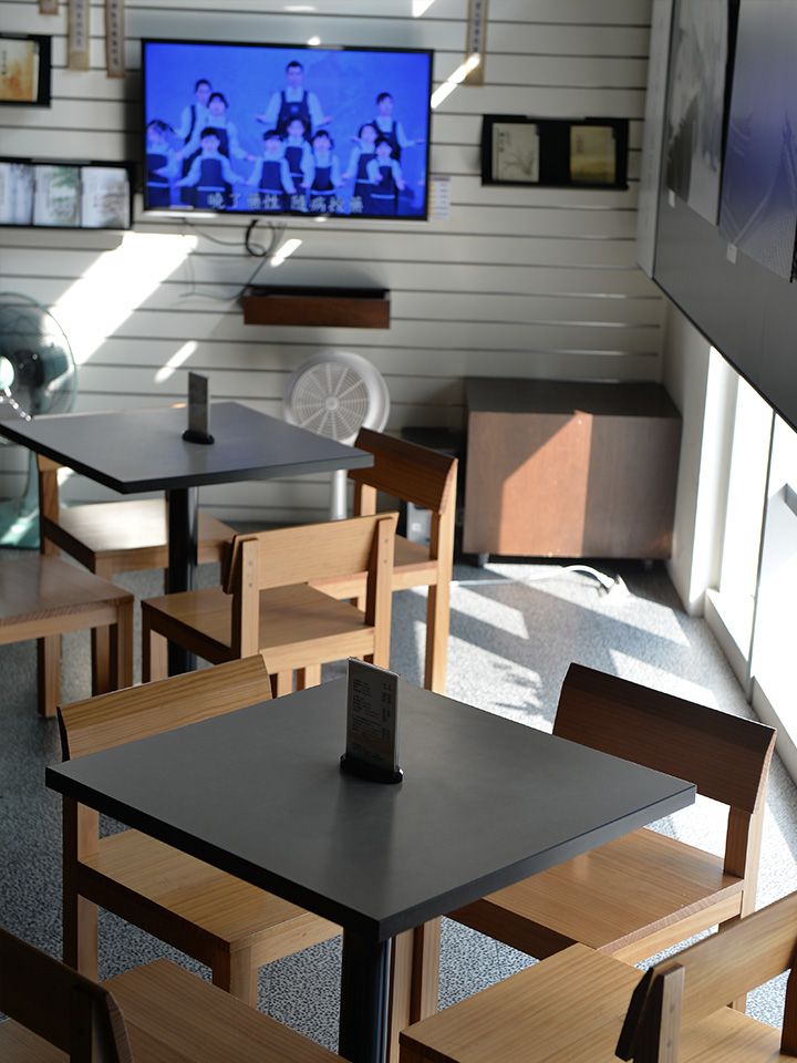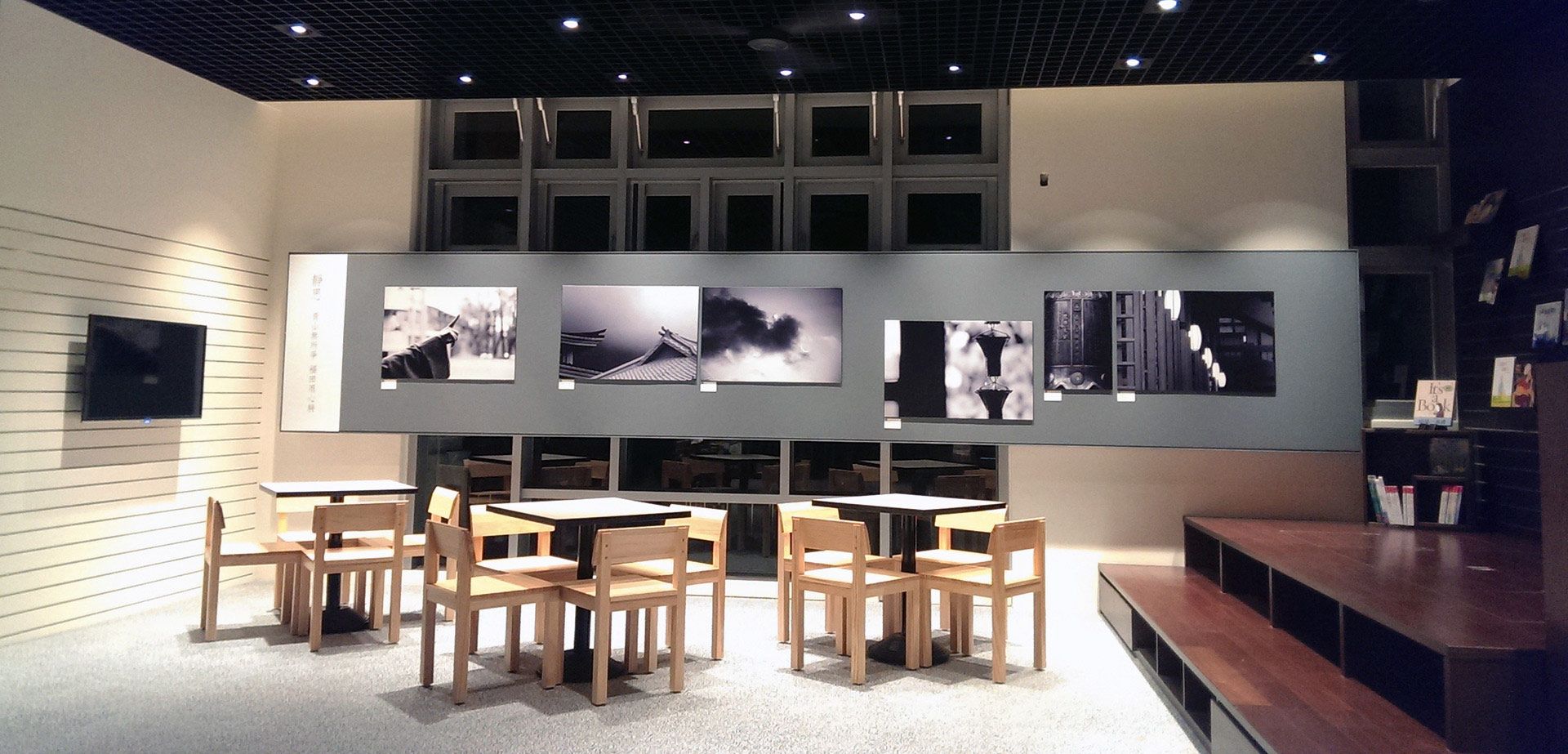 進入書軒有寧靜放鬆的感覺,具有現代感四四方方的天花板,象徵我們做人處事應要謹言慎行中規中矩。頂天立地的書櫃擺放各式書籍,讓人清楚瀏覽,顯示單純樸質的特色。靜寂清澄下的影音牆帶給人們心靈的資糧。