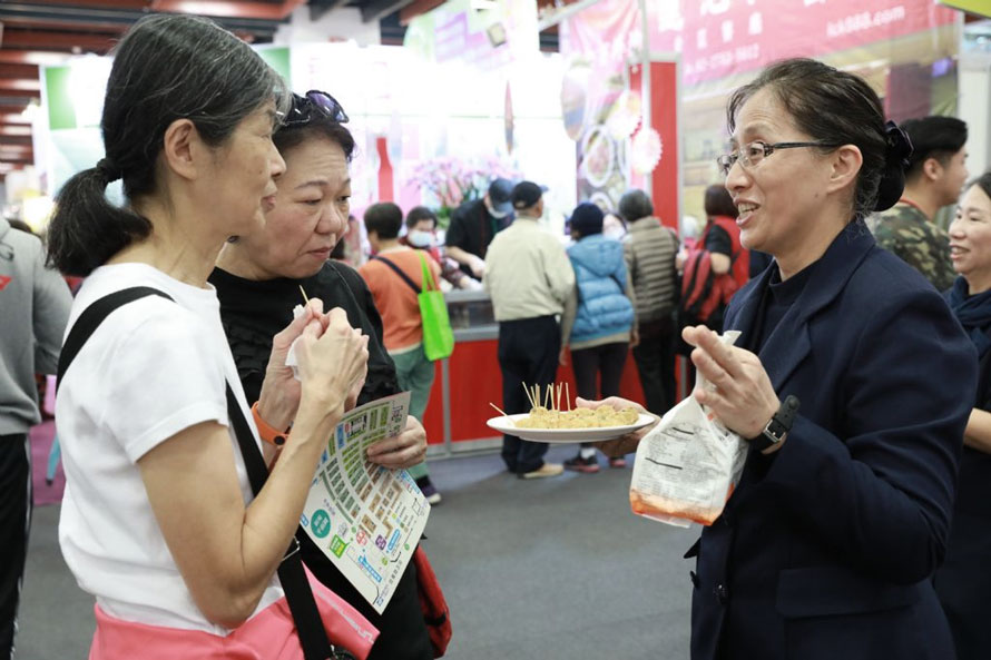 負責製作點心的志工以淨斯五穀粉與堅果,現場調製小甜點分享來賓。走道旁,亦有服務志工端著以香積飯製作的小飯糰、或端沖泡好的穀粉飲料,請經過攤位的人品嘗。攤位中一隅設有品茶區,志工親切請來客稍歇腳、茗一杯三義有機茶。