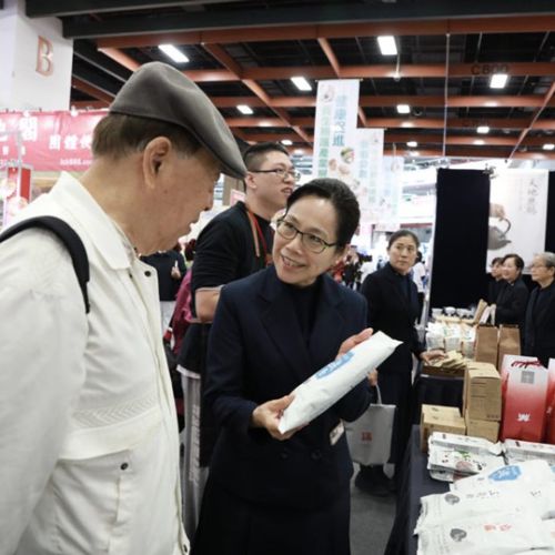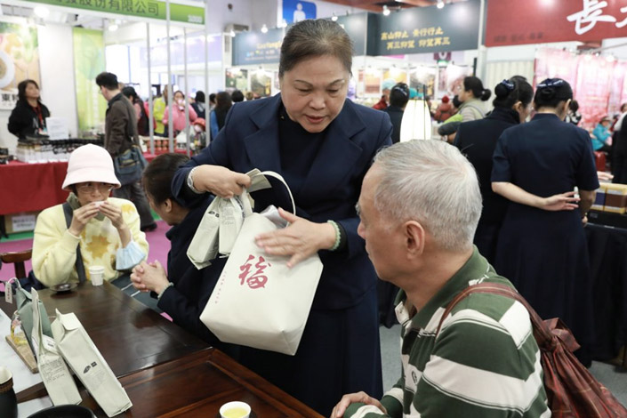 一位女士聽過慈濟志工介紹「靜思茶」的栽種、採收、烘培等製程,她非常讚歎。品過香茗,她起身走到產品陳列區,挑選了「靜思茶道」書籍,與烏龍茶Q苓膏軟糖等,她表示;要帶回家好好品賞。