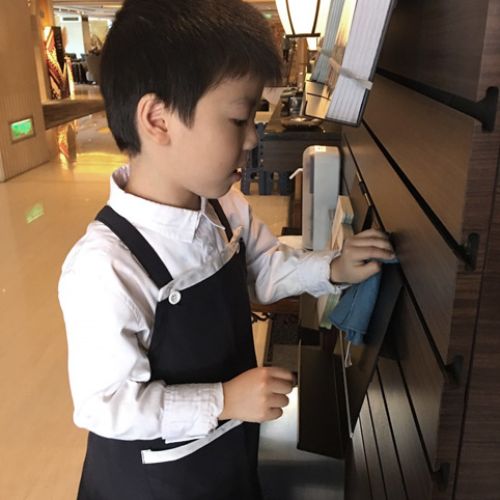 姊姊心彤更是可愛用心,每當她擦桌子時,擦一擦就蹲了下來,這樣突然的動作引發大人的好奇心。書軒同仁問:「為什麼要蹲下來了呢?」心彤說:「這樣我才看得出來,哪裡沒擦乾淨。」如此細膩的動作,真是志工典範。